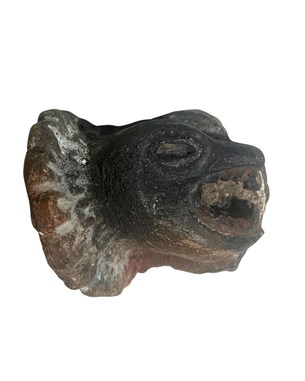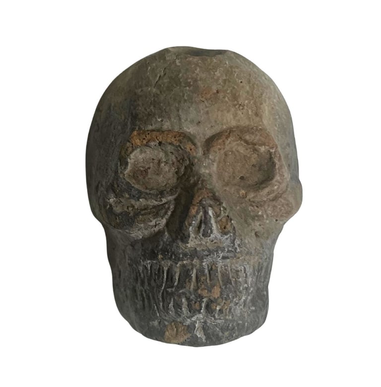 Esta cabeza de terracota corresponde a un objeto de uso ceremonial dentro de la cosmovisión mexica, donde la representación del cráneo humano simbolizaba el ciclo eterno de vida, muerte y renovación. Lejos de una visión macabra, estos elementos estaban profundamente ligados al orden cósmico, al sacrificio ritual y a la continuidad del universo. El modelado sobrio, con rasgos esquemáticos y expresivos, refleja una intención simbólica más que realista. Piezas como esta pudieron emplearse en contextos rituales, ofrendas o espacios sagrados, funcionando como recordatorios del equilibrio entre el mundo terrenal y el espiritual.