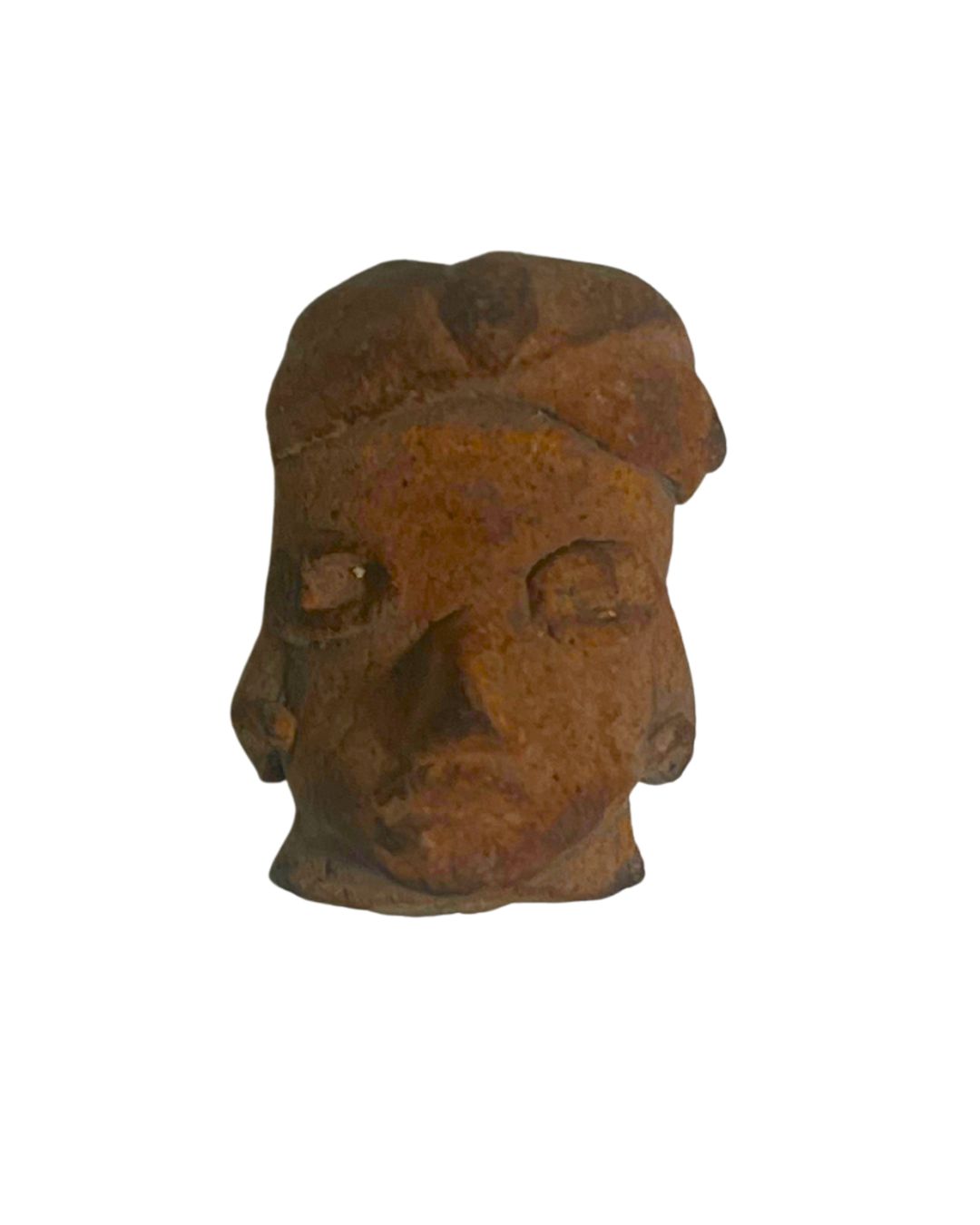 Esta pieza de barro representa una cabeza humana estilizada, característica del arte maya, donde el rostro funcionaba como símbolo de identidad, estatus y vínculo espiritual. Los rasgos faciales simplificados, el tocado esquemático y la expresión serena sugieren una intención ritual más que retratística. En la cosmovisión maya, la representación humana estaba profundamente ligada al linaje, a los ancestros y al orden sagrado del cosmos. Objetos como este pudieron emplearse en contextos ceremoniales, ofrendas o espacios domésticos con carga simbólica, actuando como intermediarios entre el mundo terrenal y el ámbito espiritual.